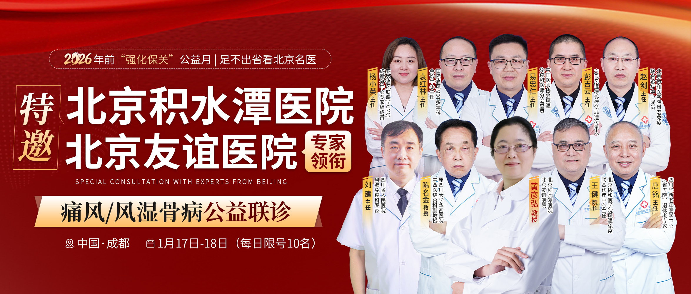 好消息!为帮大家年前搞定关节痛、健康迎马年,成都西部痛风风湿医院特邀北京积水潭医院、北京友谊医院风湿免疫科主任医师黄彦弘教授,于1月17日-18日开展京川专家公益联合会诊,让西南地区痛风/风湿骨病患者足不出省,就能享受北京顶尖诊疗资源!